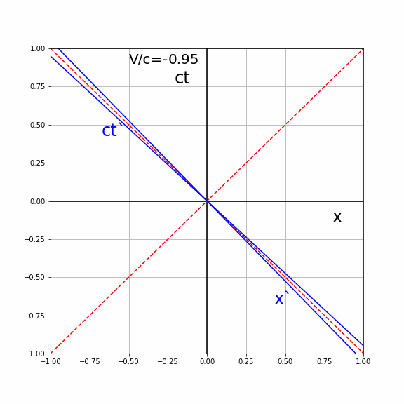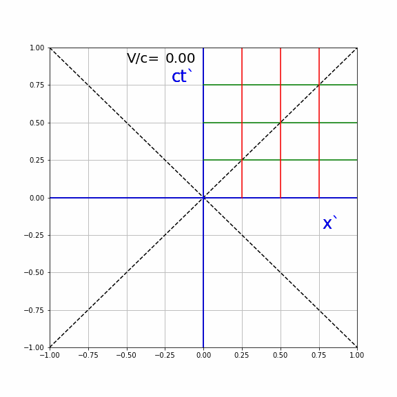 In the animation below, we see the effect of different values of V/c on the lines of constant ct′ and x′ as seen by S. For clarity, these are only drawn for V/c≥0