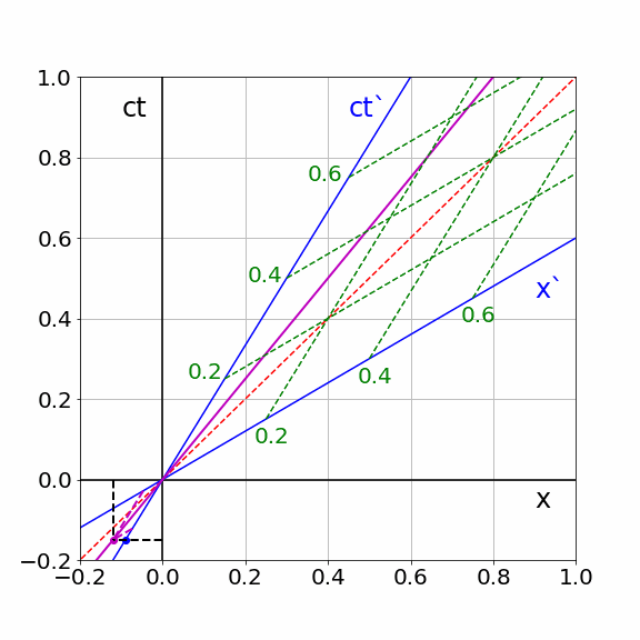 We plot the coordinate system of S′ (blue) in the coordinate system of S (black).